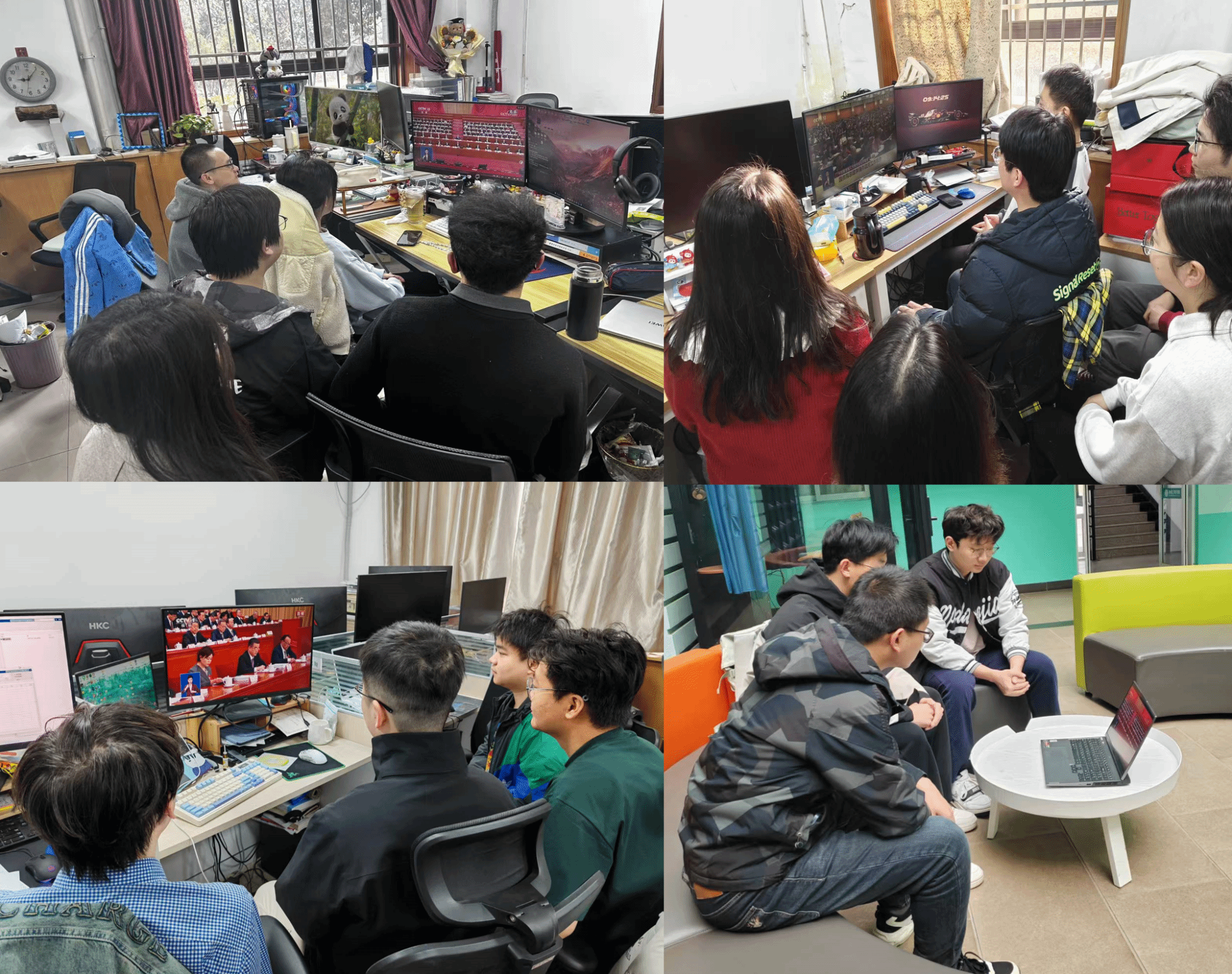 学院领导班子成员、办公室工作人员、部分师生代表分别在雁塔校区西大楼Ⅲ区421会议室、长安校区图书馆B427会议室集中收看开幕会直播,各系(所、中心)教师、各年级学生通过电视、网络、手机客户端等方式线上、线下自行收看大会盛况。全体师生认真聆听政府工作报告,一致认为大会报告精炼务实、催人奋进,对国家在过去一年及“十四五”期间取得的亮眼成绩深感自豪。师生重点学习了报告中关于“加快高水平科技自立自强”“一体推进教育科技人才发展”等内容,以及“十五五”时期的主要目标和重大任务,并迅速展开热议。