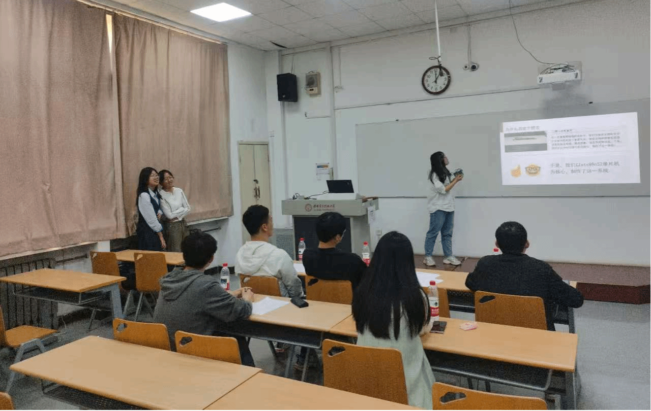 比赛现场,各参赛团队依次进行答辩展示。作品涵盖多个前沿科技领域,包括“光影‘帧’探”“生态护盾·医卫绿网”“逐日枢机,聚光智联”等。同学们通过PPT讲解、视频演示与实物操作相结合的方式,介绍了作品的创作思路、技术实现与应用价值,并分享了研发过程中遇到的挑战与解决方案。评委紧扣项目的真实性、创新性与实用性,对每件作品进行了细致点评。在肯定项目亮点的同时,着重强调了以用户实际需求与体验为导向的设计理念,鼓励同学们进一步拓宽创新视野,深入挖掘技术潜力,并为作品的持续优化提出了宝贵建议。面对评委的提问,参赛选手沉着应答,清晰阐述作品的立项背景、创新特色及发展前景,展现出扎实的专业基础与敏捷的逻辑思维能力。